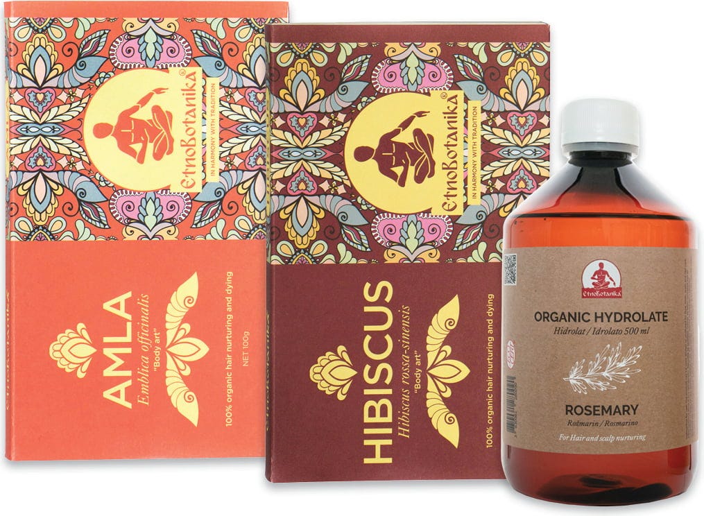 - Frauen: 20 g Amla-Pulver + 20 g Hibiskus-Pulver + 100 ml Rosmarin-Hydrosol
