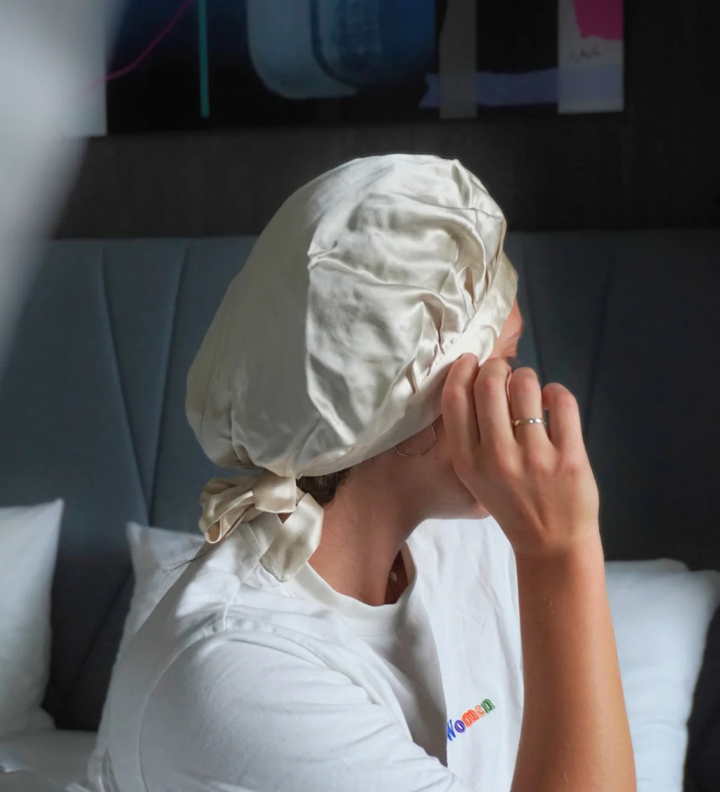 - Zieh das Bonnet abends über deine Haare oder direkt über dein Lockenband und passe es mit dem Seidenband individuell an deine Kopfform an.