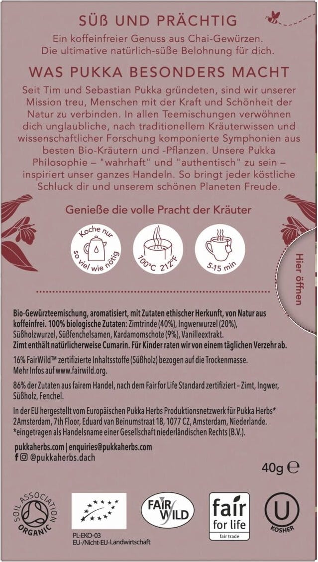 | Verantwortliches Lebensmittelunternehmen: | Lipton Teas and Infusions Germany GmbH, Axel-Springer-Platz 3, c/o WeWork, 20355, Hamburg, Deutschland, kontakt@pukkaherbs.de |