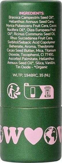 Brassica Campestris (Raps) Seed Oil[1], Helianthus Annus Seed Cera, Myrica Pubescens Fruit Cera, Cocos Nucifera (Coconut) Oil[1], Olea Europaea (Olive) Fruit Oil[1], Ricinus Communis Seed Oil, Rhus Succedanea Fruit Cera, Sorbitol/Sebacic Acid Copolymer Behenate, Aroma, Theobroma Cacao Seed Butter, Mica, Titanium Oxides, Tocopherol (Vitamin E), CI 77491, Ascorbyl Palmitate, Helianthus Annus (Sunflower) Seed Oil[1], Silicia, Vanillin, Tin Oxide