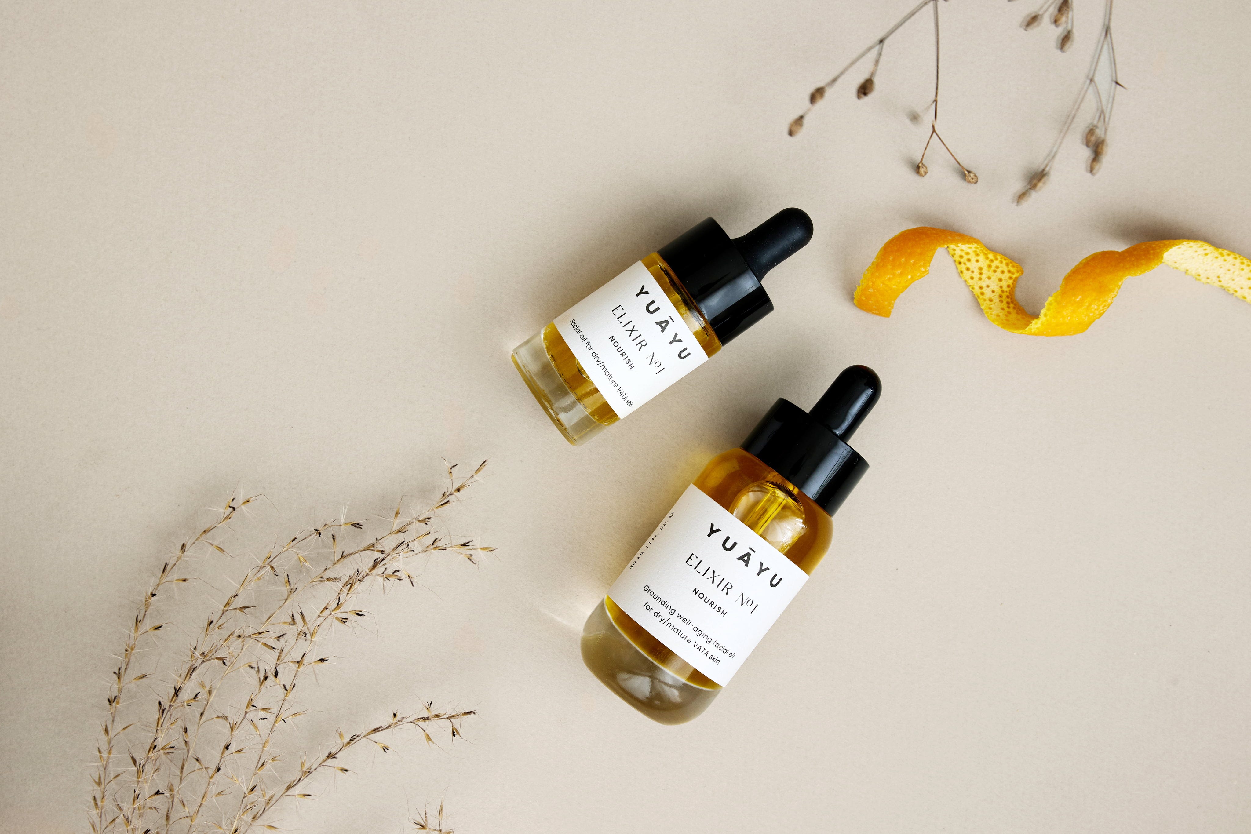 Elixir No. 1 von YUĀYU ist ein ayurvedisch inspiriertes Gesichtsöl aus liebevoll handverarbeiteten Pflanzenölen und Extrakten, das speziell für trockene und reife Vata-Haut entwickelt wurde. Die reichhaltige Formel mit Nachtkerzenextrakt, Sesam-, Brokkoli- und Himbeersamenöl sowie Bakuchiol und einem hochwertigen Algenauszug nährt die Haut intensiv, unterstützt ihre natürliche Regeneration und verleiht ein angenehm geschmeidiges Hautgefühl. Der sanfte Duft aus Rose, Amyris und süßer Orange sorgt zusätzlich für ein angenehmes Pflegeerlebnis.